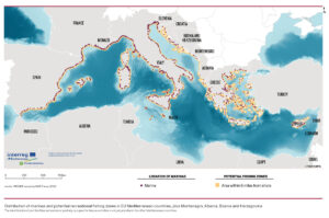 Répartition des ports de plaisance et des zones potentielles de pêche récréative dans les pays méditerranéens de l'UE, plus le Monténégro, l'Albanie et la Bosnie-Herzégovine