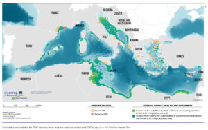 Zones potentielles propices au développement de l'éolien en mer et projets d'éolien en mer planifiés et autorisés en Méditerranée