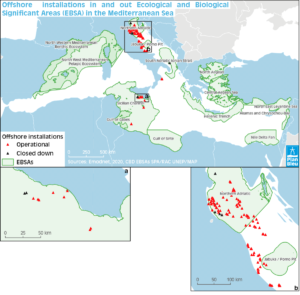 Prospection et forage offshore de produits fossiles dans les zones d’intérêt biologique en mer Planche 3-1: Borholes dans et en dehors des Zones d'Importance Ecologique et Biologique (ZIEB) en mer Méditerranée Planche 3-2: Installations offshore dans et en dehors des ZIEBs